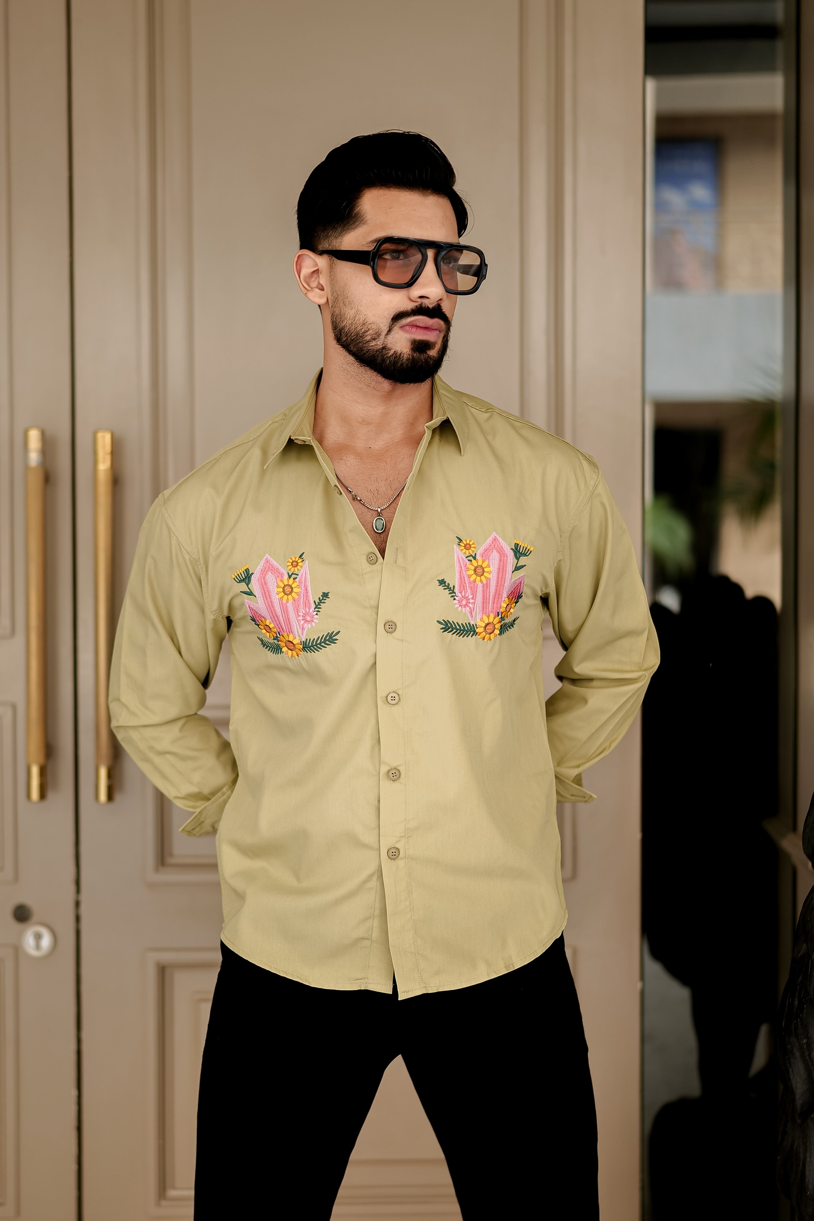 Fashion Casino Embroidery Light Yellowish Premium Cotton Shirt
